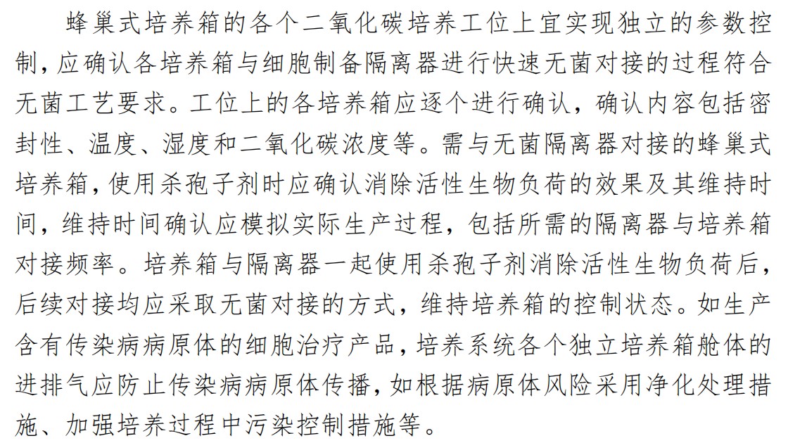 蜂巢培養(yǎng)箱是由蜂巢式多工位模塊和配套的培養(yǎng)箱組成,為細(xì)胞培養(yǎng)的常用設(shè)備,在《指南》中也有較詳細(xì)的闡述,主要包括設(shè)備構(gòu)成與內(nèi)部環(huán)境要求、設(shè)備電源要求、氣源要求、參數(shù)和性能的確認(rèn)等。