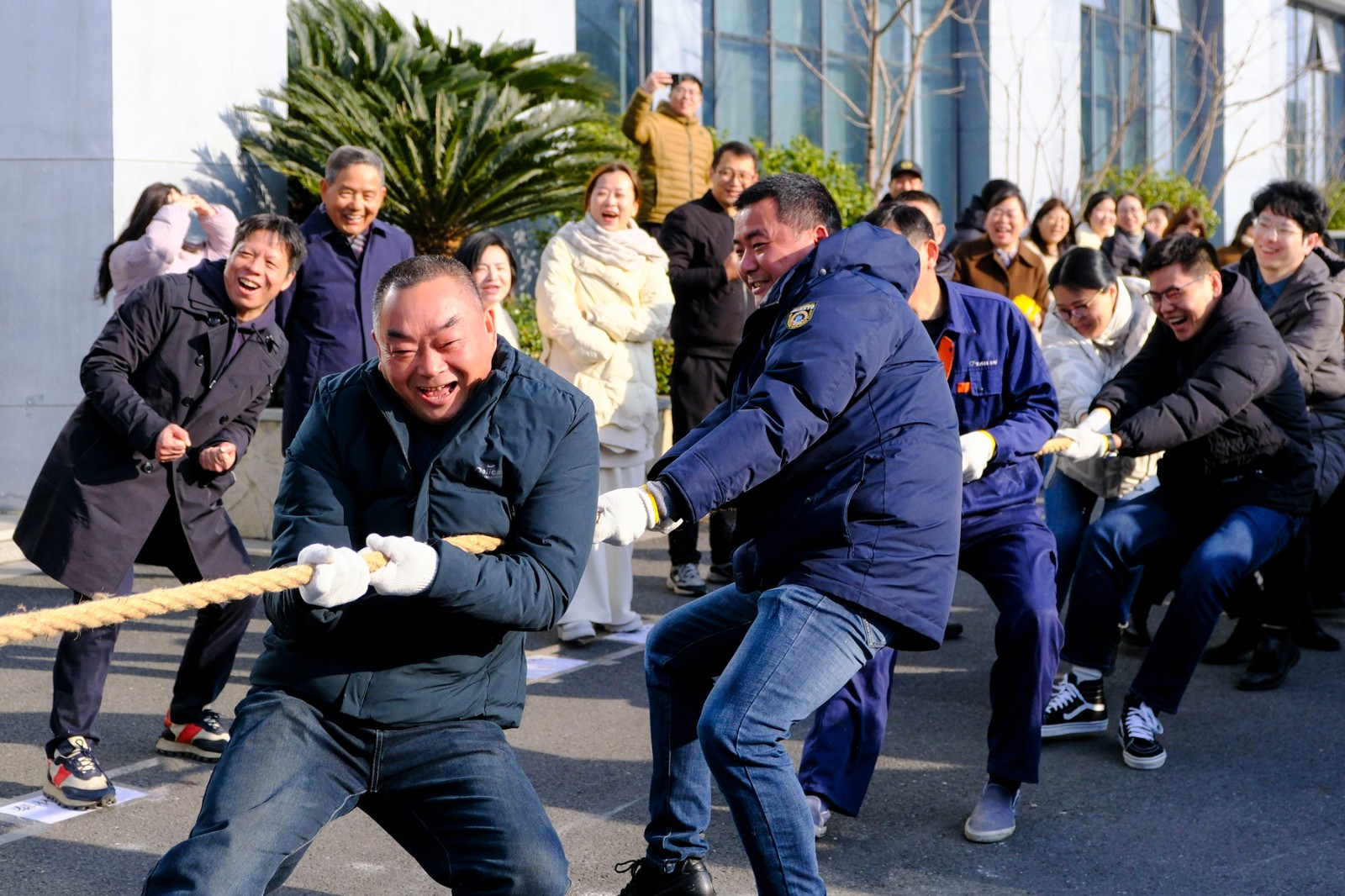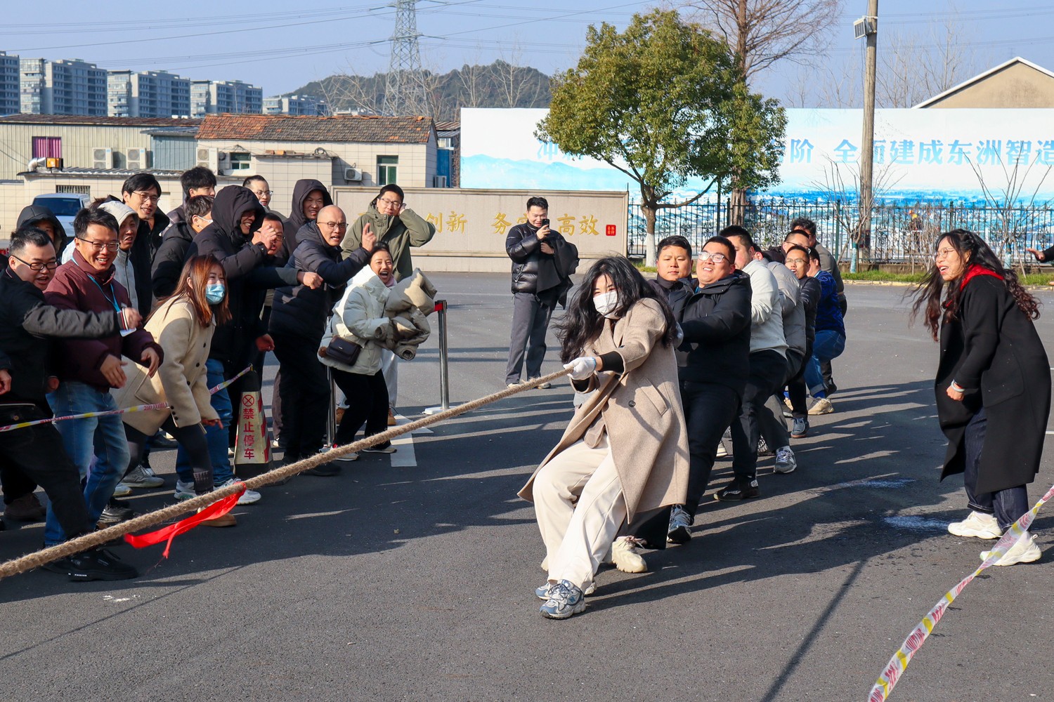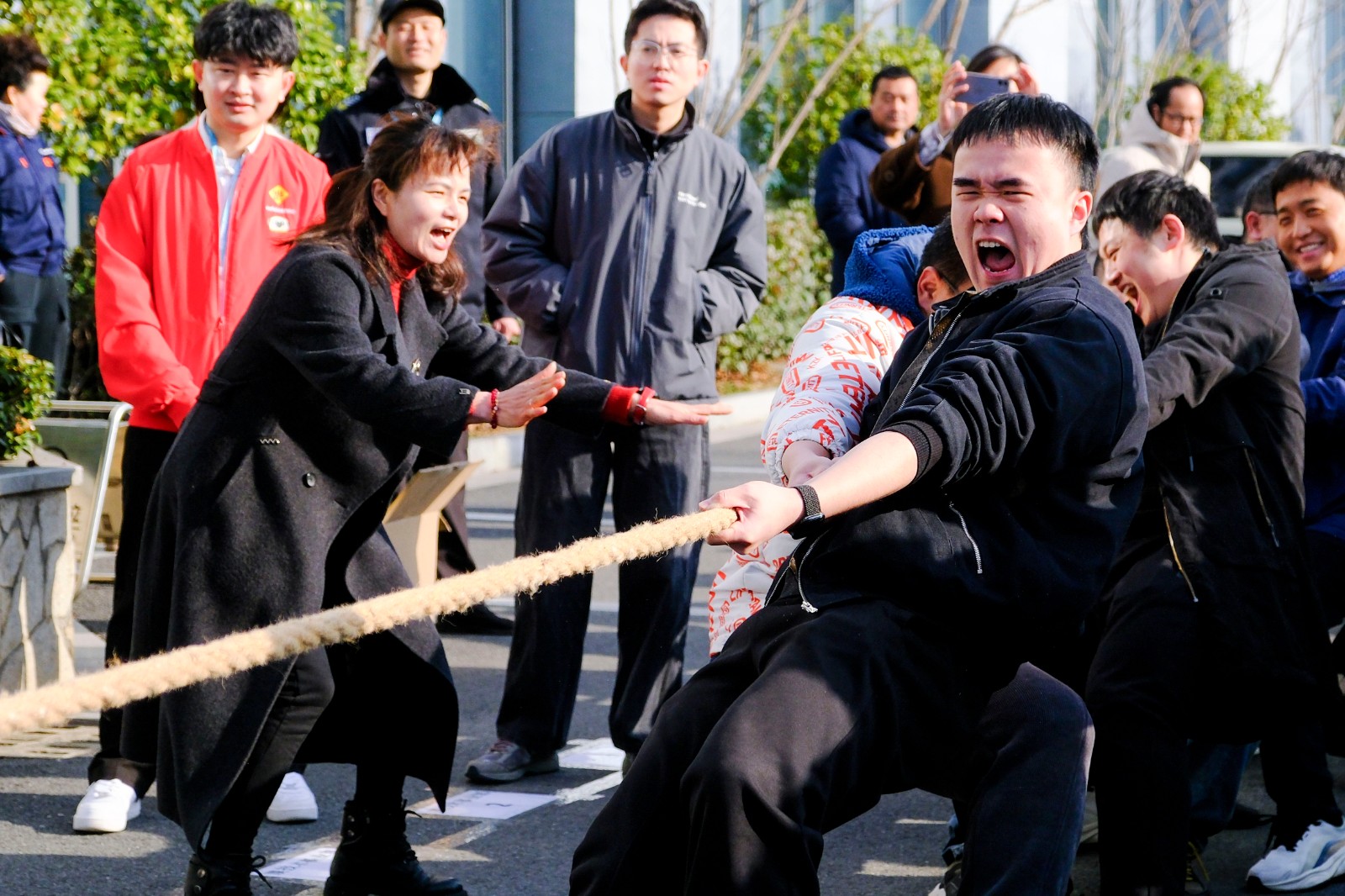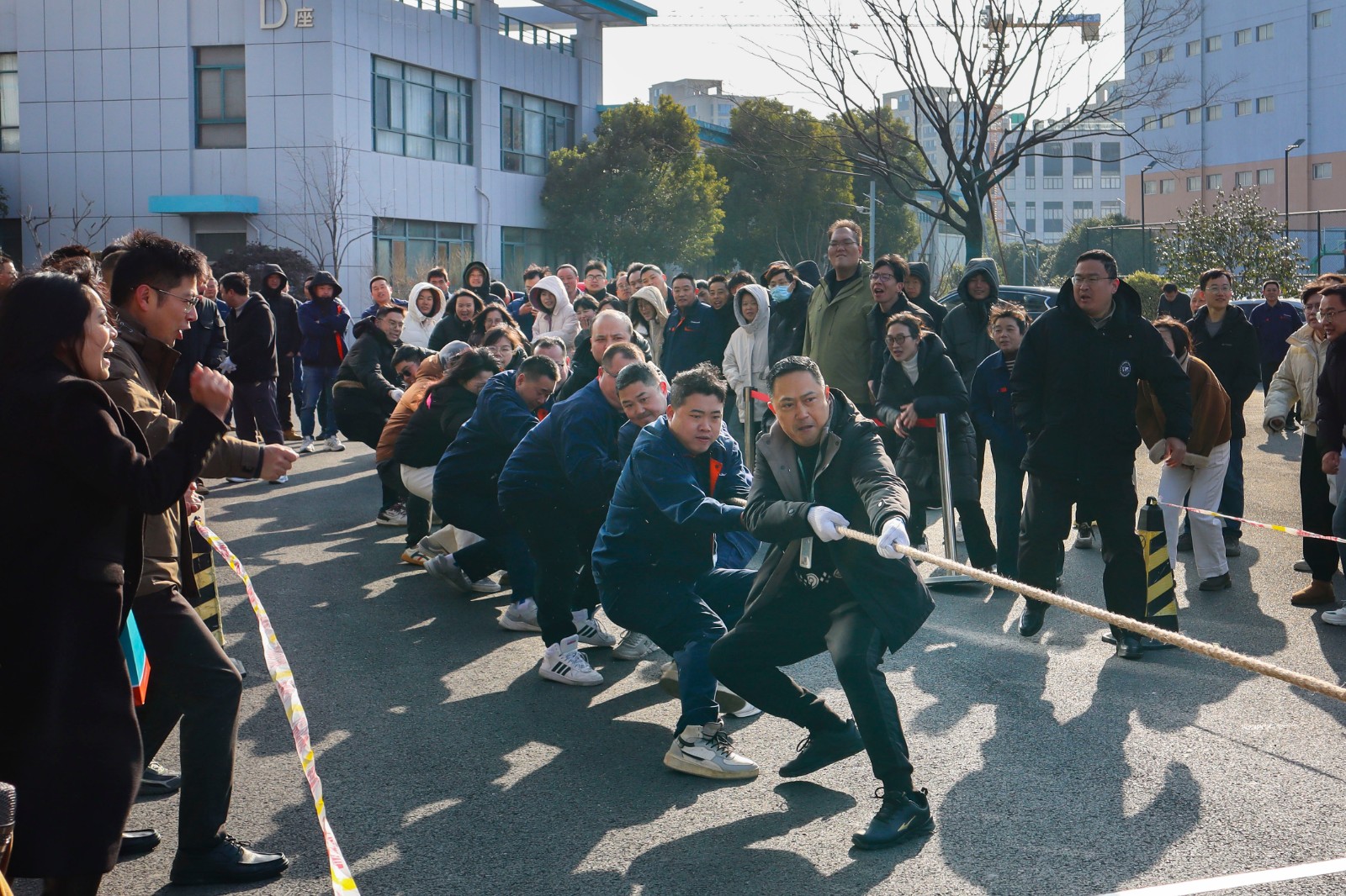 隨著裁判員的一聲清脆哨響,兩大園區(qū)的拔河比賽正式打響。參賽隊(duì)員們起繩、拉緊、挺身、開(kāi)拔,瞬間的爆發(fā)力沖向云霄,各個(gè)憋的面紅耳赤,使出了渾身力氣,大家一起一二一二的喊著口號(hào),卯足勁往一處使,將力量擰成一股繩,團(tuán)結(jié)一致、頑強(qiáng)拼搏。場(chǎng)邊啦啦隊(duì)們也不甘示弱,吶喊聲、助威聲一波一波沖擊著賽場(chǎng),氣氛熱烈愉悅。